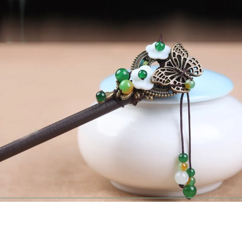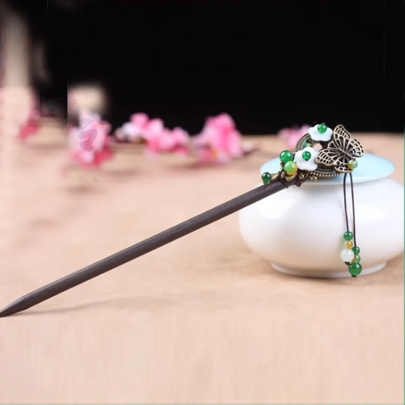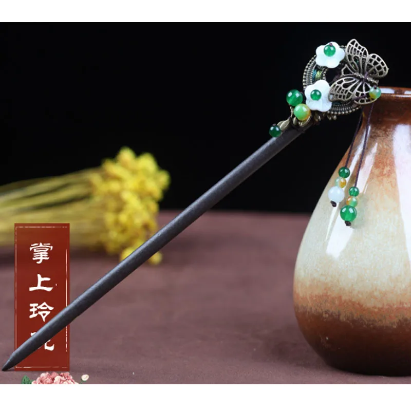 BEST Handmade Kanzashi Natural Wood Jade Hair Bun Holder Hair Stick Vintage Classic Hair Accessory HS027